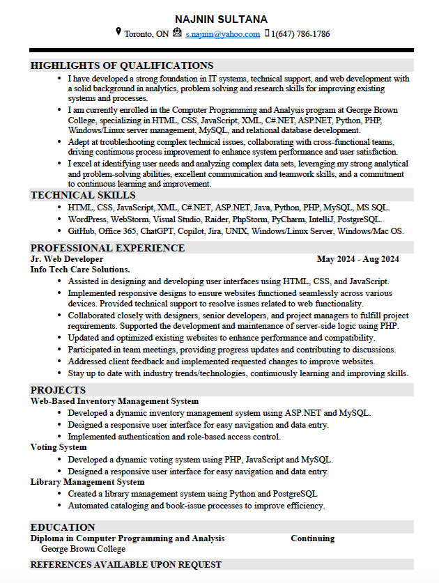 I am a Computer Programming and Analysis student at George Brown College with a passion for building modern web and mobile applications. I have experience with technologies like ASP.NET, Python, JavaScript, C#, and SQL.